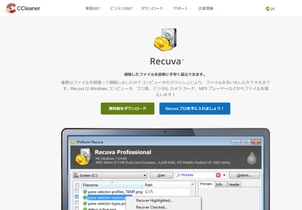 データ復元ソフト無料おすすめ①はRecuva(Piriform )です。
