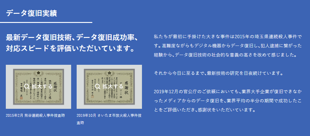 業界大手企業がデータ復旧できなかったメディアからのデータ復旧を、業界平均の半分の期間で成功したことを埼玉県警から評価され、感謝状を受領しています。これは最高難易度のデータ復旧に成功したわかりやすい事例ではないでしょうか。